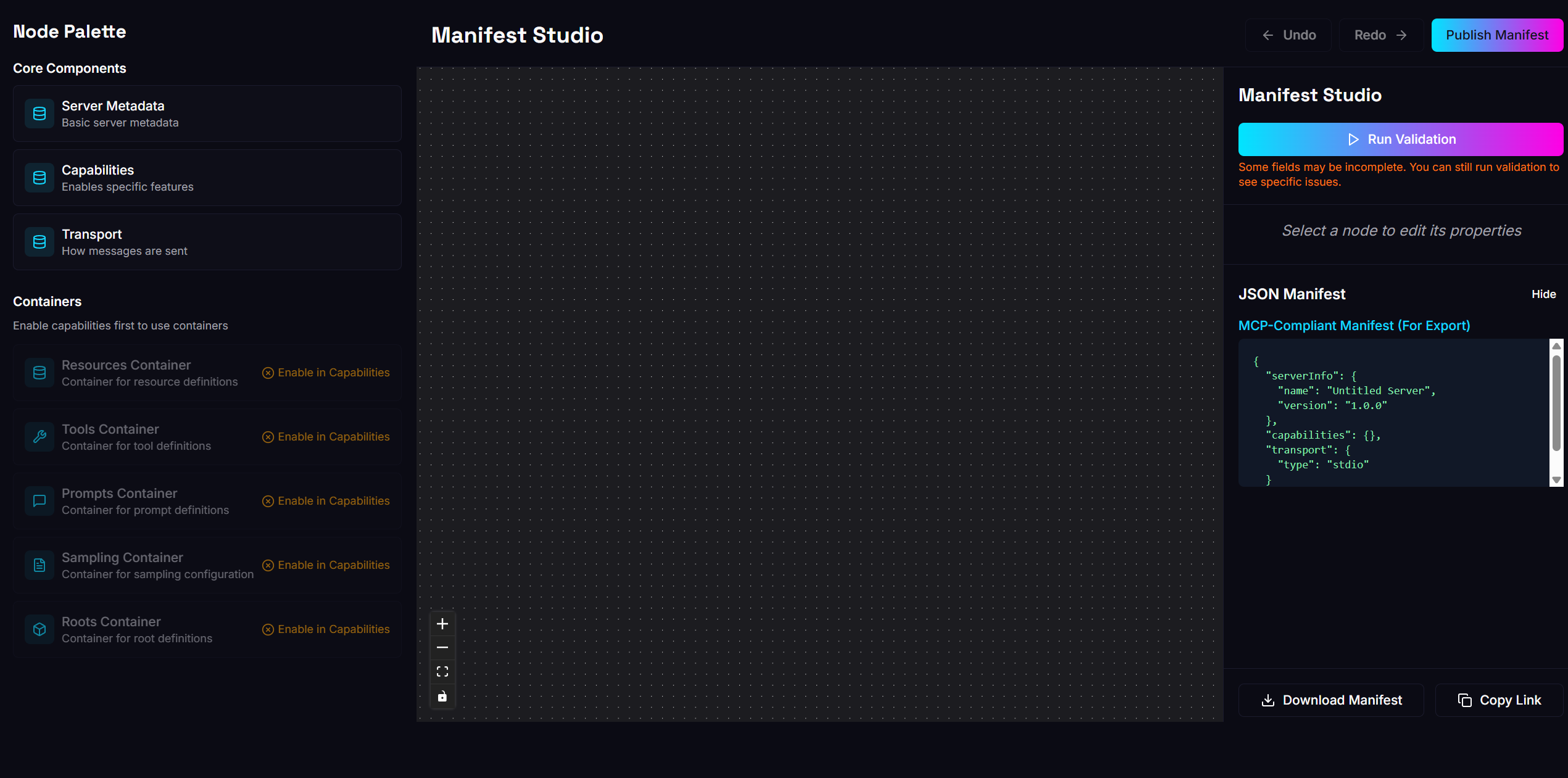 * **One‑Click Export**: Generate production‑ready `manifest.json` files instantly, ready for deployment or integration with any AI client.